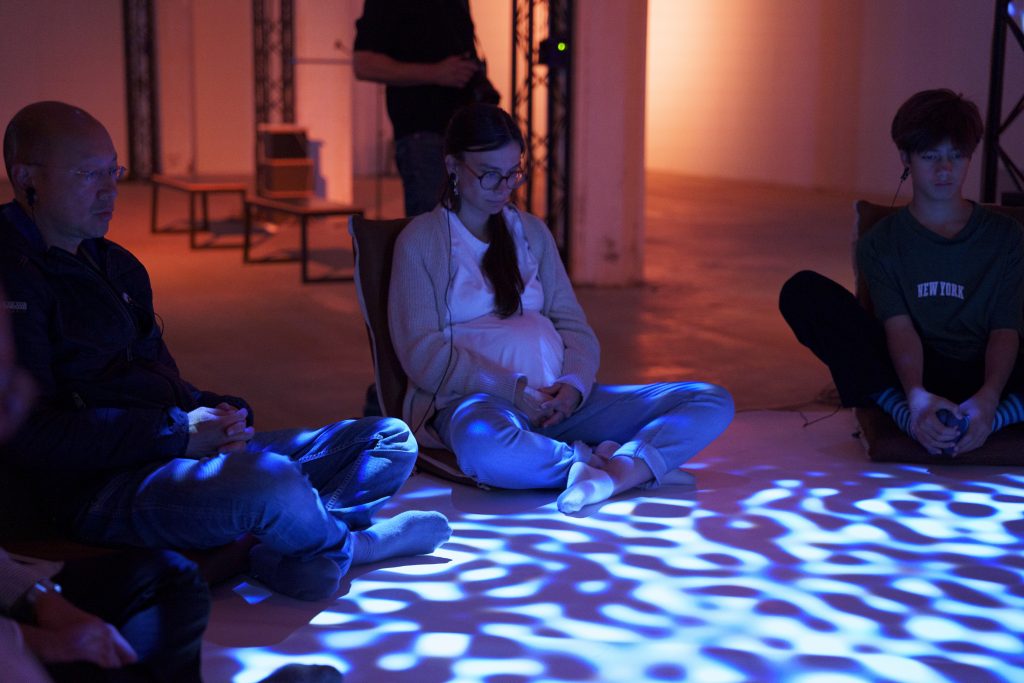 In sessions of 10 people, heart rate synchronisation is experienced live. Participants wear a sensor (earclip) and are guided through a soundscape and voice-over, encouraging them to slow down and breathe deeper. As the breath and heart rates align, individual light circles on the floor transform into complex geometric patterns, representing the group rhythm. The installation literally shows what it means to be in connection as a group.